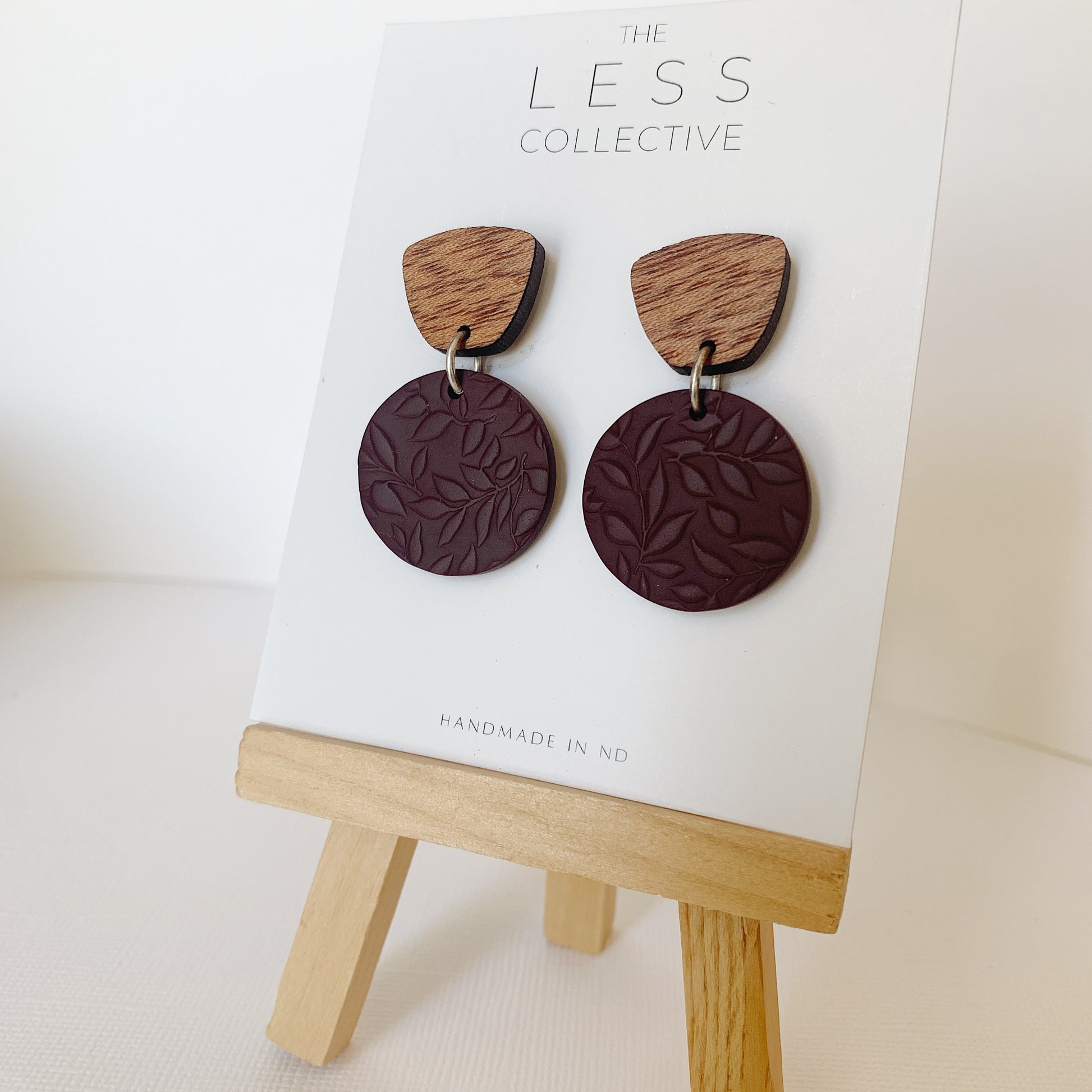 The original favorite Cora shape, with the new trapezoid wood tops - in deep merlot red, with stamped garden detail.