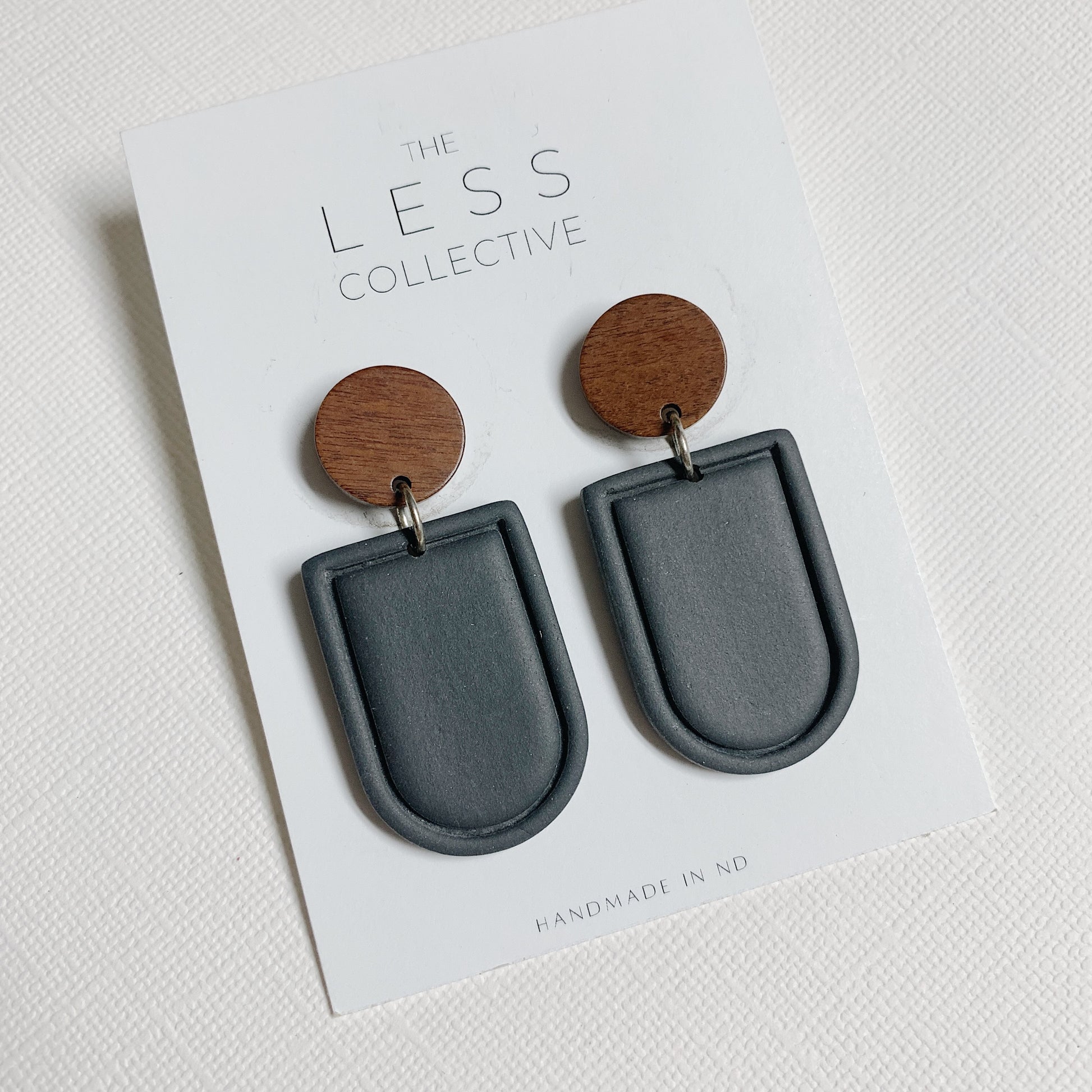 Similar to the Sloane earring shape, but a little more sleek and feminine with a wood stud top. This charcoal grey has some slight white speckles with an impressed border detail.