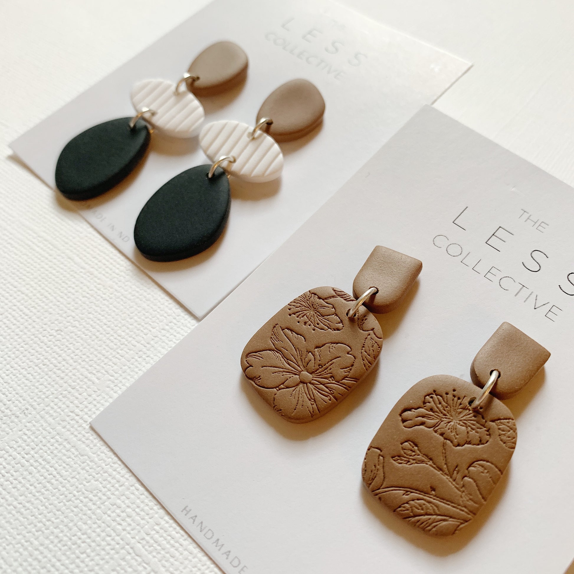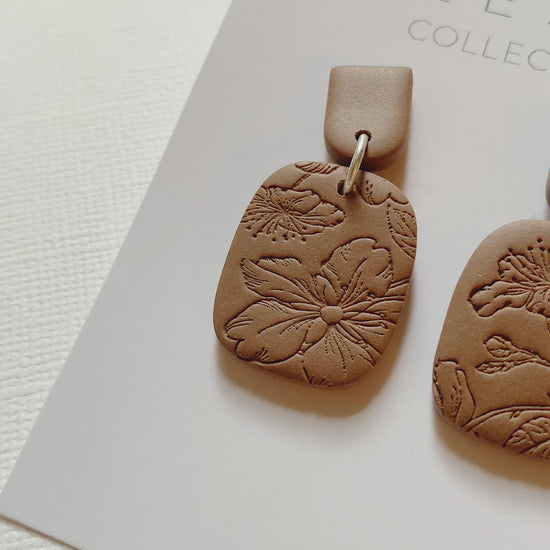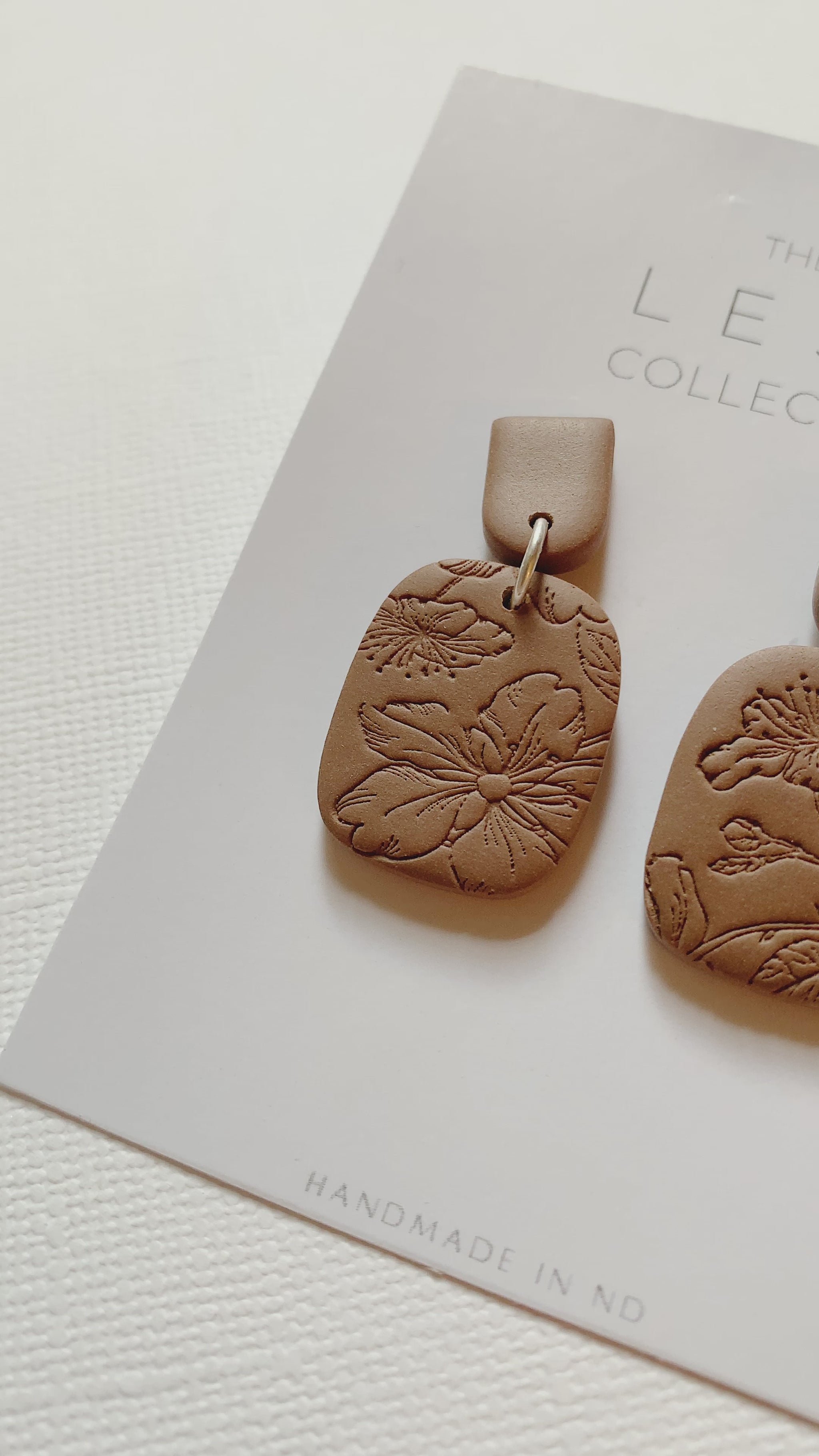 A new organic shaped statement earring! This variation has a clay drop stud top and the rich camel brown floral blossom imprinted bottom. This brown and floral combo almost look like a patterned leather and we are LOVING it.