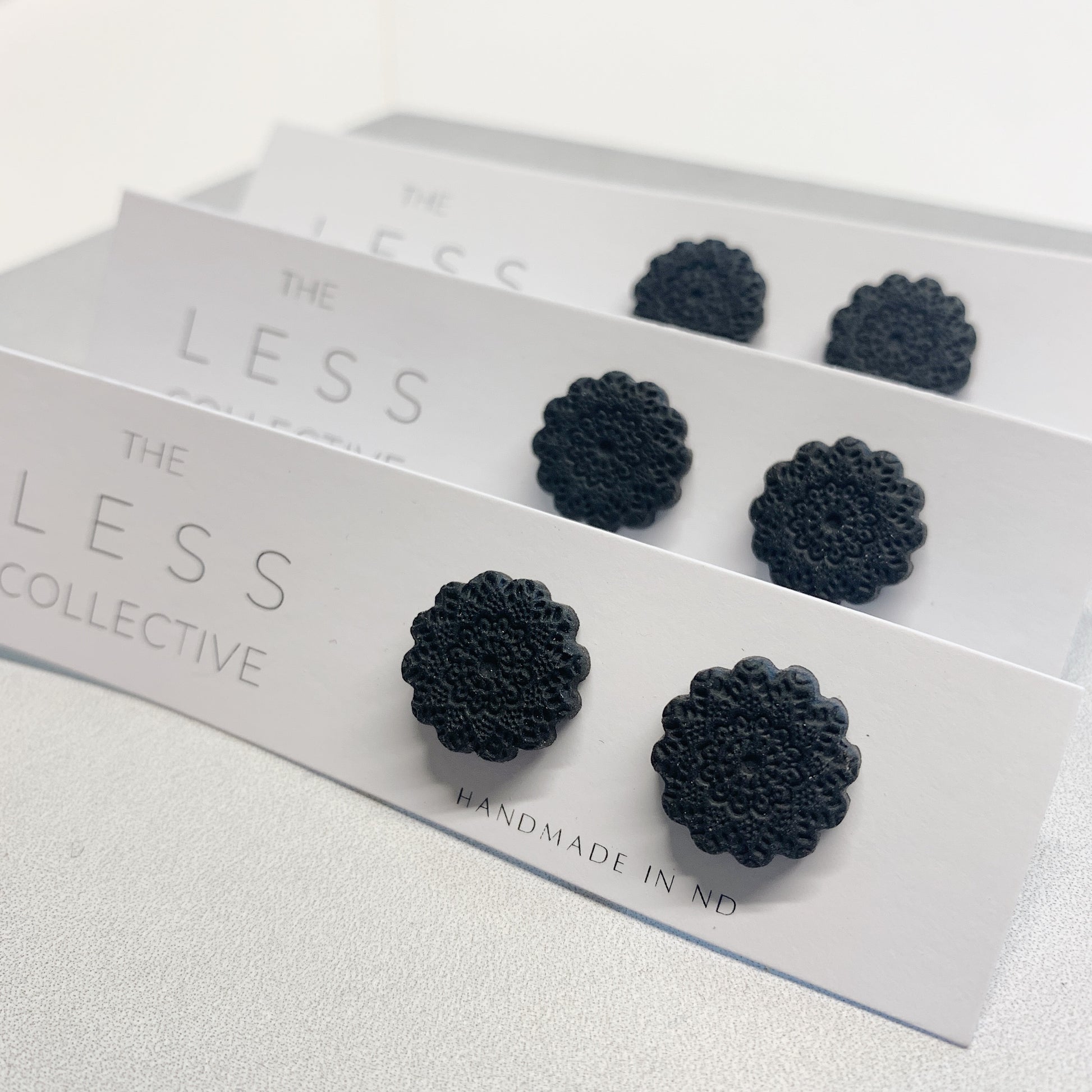 New stud! An intricate mandala design. In this matte black, this earring is a neutral color to wear with anything, but still a statement stud!